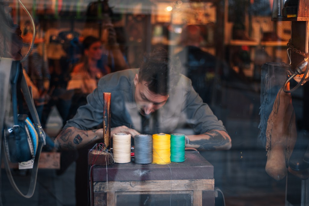 A peek inside a Milanese workshop reveals a leather artist at work. With colorful materials and focused hands, he creates unique pieces. This photo captures the passion and dedication behind handmade crafts.